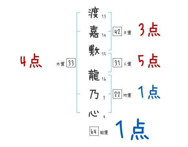 渡嘉敷龍乃心さんの画数の鑑定結果