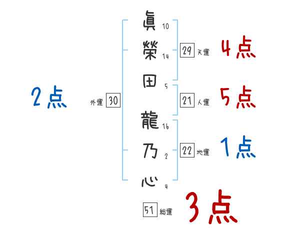 総運![]() | 眞榮田龍乃心さんの総運は51画の3つ星!変化が激しく、危険に注意。堅実な性格。 あなたの人生を表す1番重要な運勢です。生涯を通じて影響する総合運となり、主に50歳以降の晩年期に影響を及ぼします。 |