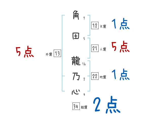 総運![]() | 角田龍乃心さんの総運は34画の2つ星!独創性に優れるが、自尊心が強く災難に注意しましょう。 あなたの人生を表す1番重要な運勢です。生涯を通じて影響する総合運となり、主に50歳以降の晩年期に影響を及ぼします。 |