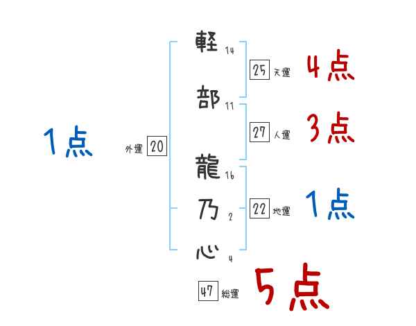 地運![]() | 軽部龍乃心さんの地運は22画の1つ星!努力することが苦手ないっぽう手先が器用。芸術性にも優れる。 個性を表す基礎的な運勢です。性格形成や対人関係、行動力など家庭環境に影響されます。主に誕生してから20歳くらいまでの若年期の運勢を表します。 |