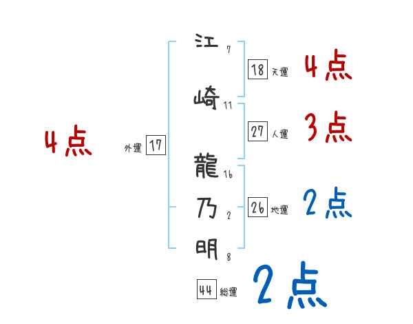 天運![]() | 江崎龍乃明さんの天運は18画の4つ星!情熱的で剛気。忍耐力があり信頼される。 家系が持つ宿命的な運勢を表します。祖先から受け継いだ苗字ですので自分の力が及びません。家柄を象徴します。 |