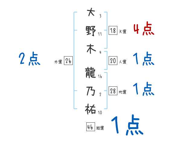 天運![]() | 大野木龍乃祐さんの天運は18画の4つ星!情熱的で剛気。忍耐力があり信頼される。 家系が持つ宿命的な運勢を表します。祖先から受け継いだ苗字ですので自分の力が及びません。家柄を象徴します。 |