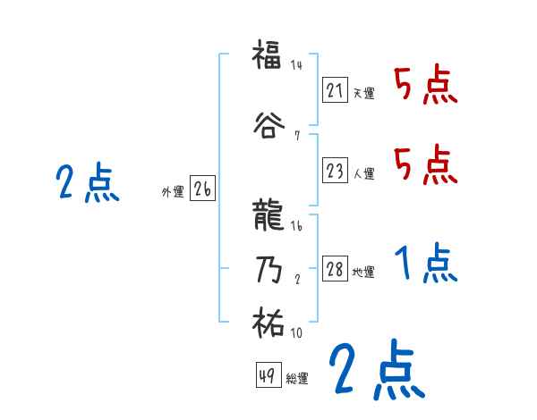 外運![]() | 福谷龍乃祐さんの外運は26画の2つ星!波瀾万丈かも。信頼できる人を大事にしましょう。 生活面を象徴する運勢です。外部から受ける影響力を表し、結婚運、家庭運や職場、環境への順応性を表します。 |