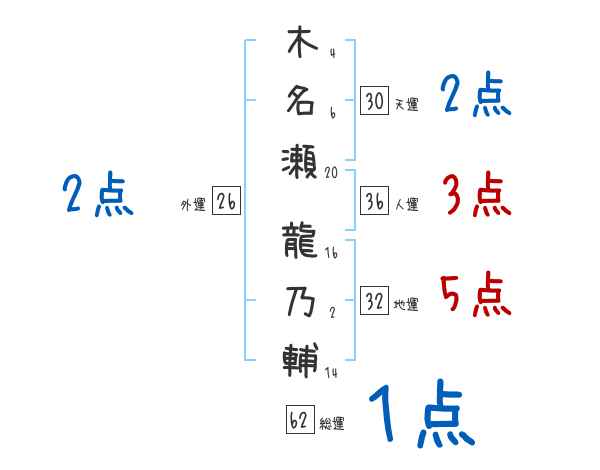 天運![]() | 木名瀬龍乃輔さんの天運は30画の2つ星!浮き沈みの激しさに注意しましょう。 家系が持つ宿命的な運勢を表します。祖先から受け継いだ苗字ですので自分の力が及びません。家柄を象徴します。 |