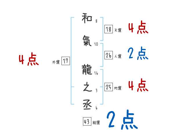 天運![]() | 和氣龍之丞さんの天運は18画の4つ星!情熱的で剛気。忍耐力があり信頼される。 家系が持つ宿命的な運勢を表します。祖先から受け継いだ苗字ですので自分の力が及びません。家柄を象徴します。 |