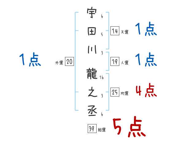 総運![]() | 宇田川龍之丞さんの総運は39画の5つ星!社交性に優れ人望が厚い。人の上に立ち成功する。 あなたの人生を表す1番重要な運勢です。生涯を通じて影響する総合運となり、主に50歳以降の晩年期に影響を及ぼします。 |