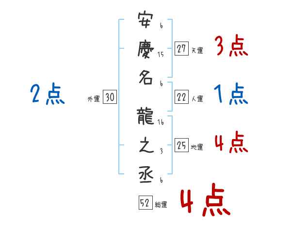 総運![]() | 安慶名龍之丞さんの総運は52画の4つ星!先見性と独創性に優れ考える力がある。強運の持ち主。 あなたの人生を表す1番重要な運勢です。生涯を通じて影響する総合運となり、主に50歳以降の晩年期に影響を及ぼします。 |