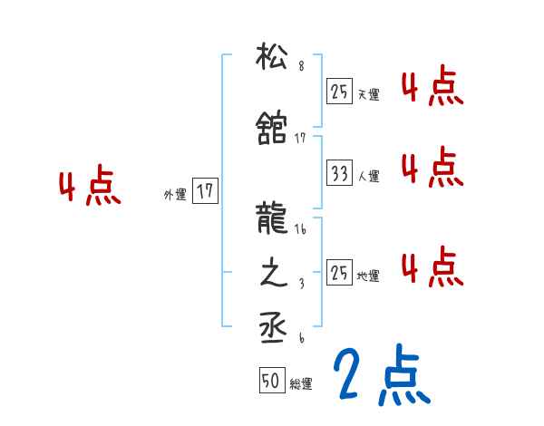 外運![]() | 松舘龍之丞さんの外運は17画の4つ星!積極的な行動力。地位を気づき財産を手に入れる。純粋な心と直感力。 生活面を象徴する運勢です。外部から受ける影響力を表し、結婚運、家庭運や職場、環境への順応性を表します。 |