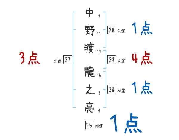 人運![]() | 中野渡龍之亮さんの人運は29画の4つ星!完全主義で才能がある。厳格な心の持ち主。 性格や才能などを表す2番目に重要な運勢です。人間関係や協調性、社会的な成功に影響します。主に20歳から50歳ぐらいまでの中年期の運勢を表します。 |