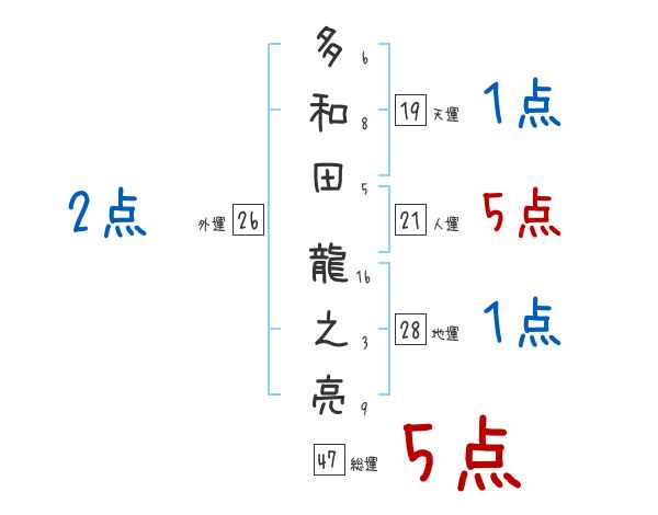 外運![]() | 多和田龍之亮さんの外運は26画の2つ星!波瀾万丈かも。信頼できる人を大事にしましょう。 生活面を象徴する運勢です。外部から受ける影響力を表し、結婚運、家庭運や職場、環境への順応性を表します。 |