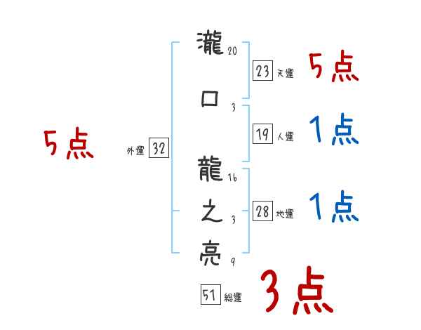 | 総運  | 瀧口龍之亮さんの総運は51画の3つ星!変化が激しく、危険に注意。堅実な性格。あなたの人生を表す1番重要な運勢です。生涯を通じて影響する総合運となり、主に50歳以降の晩年期に影響を及ぼします。 |