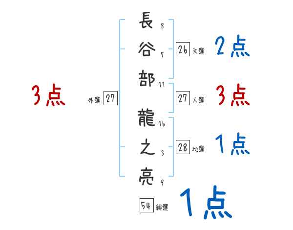 外運![]() | 長谷部龍之亮さんの外運は27画の3つ星!頭脳明晰だが強情で摩擦が多い傾向。孤立に注意。 生活面を象徴する運勢です。外部から受ける影響力を表し、結婚運、家庭運や職場、環境への順応性を表します。 |