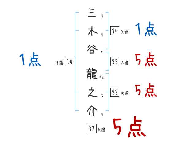 外運![]() | 三木谷龍之介さんの外運は14画の1つ星!人に対して優しいがストレスを溜め込みがち。人間関係のトラブルを避けるよう気をつけましょう。 生活面を象徴する運勢です。外部から受ける影響力を表し、結婚運、家庭運や職場、環境への順応性を表します。 |