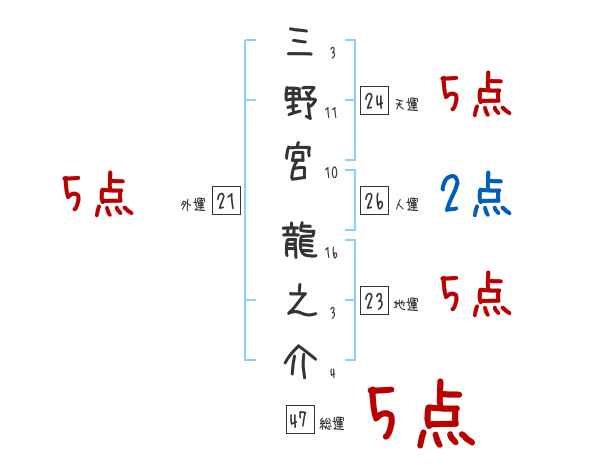 天運![]() | 三野宮龍之介さんの天運は24画の5つ星!家庭運が良く順調な人生。金運にも恵まれる。 家系が持つ宿命的な運勢を表します。祖先から受け継いだ苗字ですので自分の力が及びません。家柄を象徴します。 |