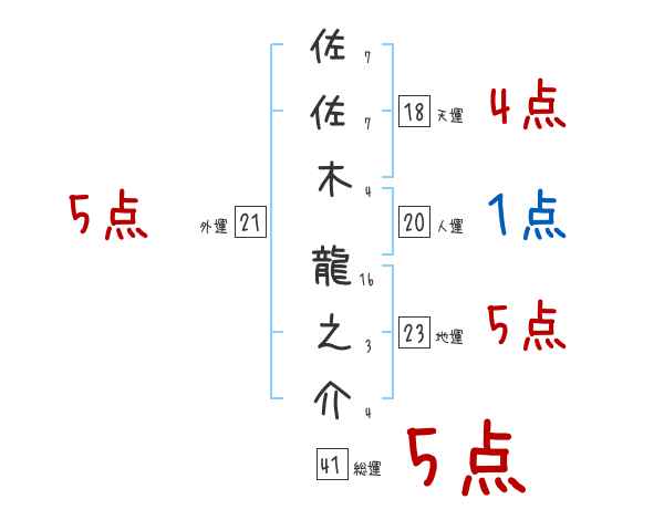 天運![]() | 佐佐木龍之介さんの天運は18画の4つ星!情熱的で剛気。忍耐力があり信頼される。 家系が持つ宿命的な運勢を表します。祖先から受け継いだ苗字ですので自分の力が及びません。家柄を象徴します。 |