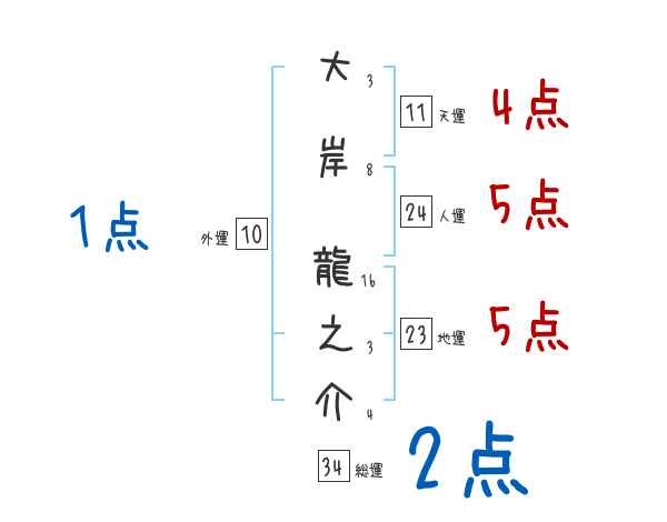 総運![]() | 大岸龍之介さんの総運は34画の2つ星!独創性に優れるが、自尊心が強く災難に注意しましょう。 あなたの人生を表す1番重要な運勢です。生涯を通じて影響する総合運となり、主に50歳以降の晩年期に影響を及ぼします。 |