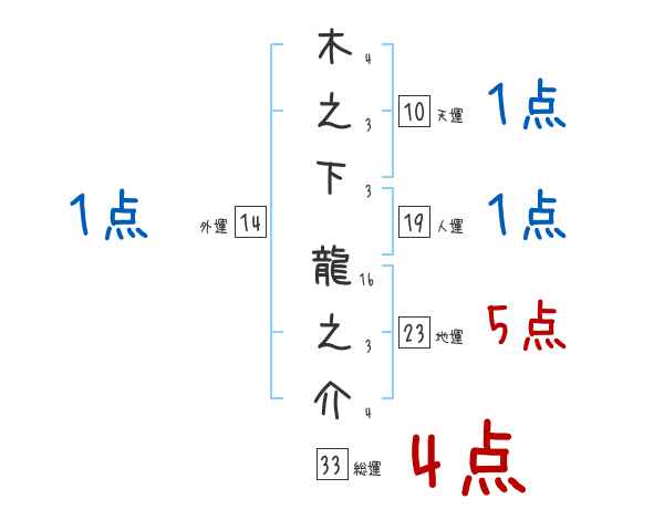 天運![]() | 木之下龍之介さんの天運は10画の1つ星!不安を感じやすい傾向。ストレスを抱えないように注意しましょう。 家系が持つ宿命的な運勢を表します。祖先から受け継いだ苗字ですので自分の力が及びません。家柄を象徴します。 |