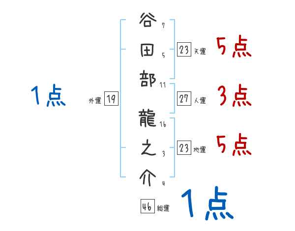 天運![]() | 谷田部龍之介さんの天運は23画の5つ星!想像力に優れ活力がある。一代で成功し名誉を手に入れる。 家系が持つ宿命的な運勢を表します。祖先から受け継いだ苗字ですので自分の力が及びません。家柄を象徴します。 |