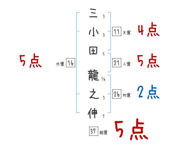 人運![]() | 三小田龍之伸さんの人運は21画の5つ星!統率力がある。独立し成功する。名誉を手に入れる。 性格や才能などを表す2番目に重要な運勢です。人間関係や協調性、社会的な成功に影響します。主に20歳から50歳ぐらいまでの中年期の運勢を表します。 |