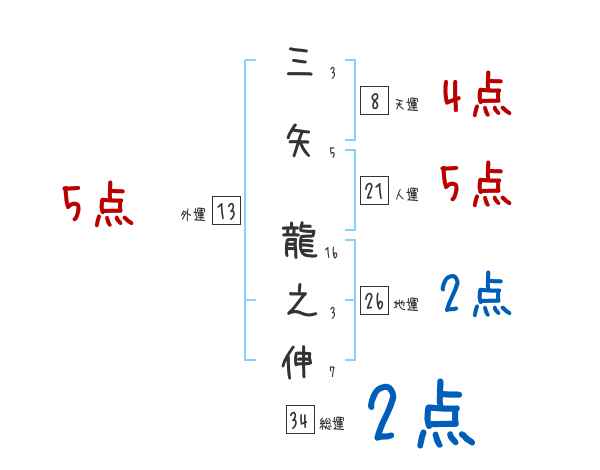 人運![]() | 三矢龍之伸さんの人運は21画の5つ星!統率力がある。独立し成功する。名誉を手に入れる。 性格や才能などを表す2番目に重要な運勢です。人間関係や協調性、社会的な成功に影響します。主に20歳から50歳ぐらいまでの中年期の運勢を表します。 |
