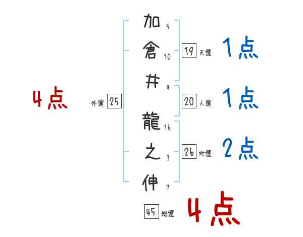 外運![]() | 加倉井龍之伸さんの外運は25画の4つ星!個性があり才能があふれる。強運の持ち主で発展する。 生活面を象徴する運勢です。外部から受ける影響力を表し、結婚運、家庭運や職場、環境への順応性を表します。 |