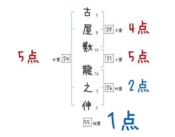 外運![]() | 古屋敷龍之伸さんの外運は24画の5つ星!家庭運が良く順調な人生。金運にも恵まれる。 生活面を象徴する運勢です。外部から受ける影響力を表し、結婚運、家庭運や職場、環境への順応性を表します。 |
