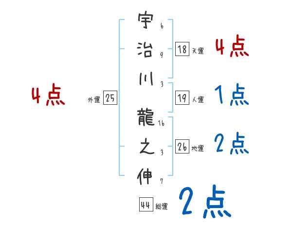 総運![]() | 宇治川龍之伸さんの総運は44画の2つ星!誠実で慎重な性格。物事を考えすぎないように注意しましょう。 あなたの人生を表す1番重要な運勢です。生涯を通じて影響する総合運となり、主に50歳以降の晩年期に影響を及ぼします。 |