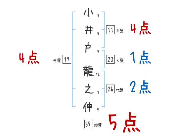 天運![]() | 小井戸龍之伸さんの天運は11画の4つ星!着実に富や地位を得る幸運な人生。 家系が持つ宿命的な運勢を表します。祖先から受け継いだ苗字ですので自分の力が及びません。家柄を象徴します。 |