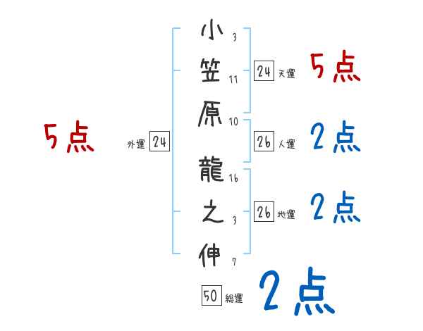 天運![]() | 小笠原龍之伸さんの天運は24画の5つ星!家庭運が良く順調な人生。金運にも恵まれる。 家系が持つ宿命的な運勢を表します。祖先から受け継いだ苗字ですので自分の力が及びません。家柄を象徴します。 |