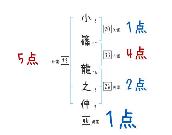外運![]() | 小篠龍之伸さんの外運は13画の5つ星!才能に恵まれ人気がある。名声を手に入れる。円満な人生。 生活面を象徴する運勢です。外部から受ける影響力を表し、結婚運、家庭運や職場、環境への順応性を表します。 |