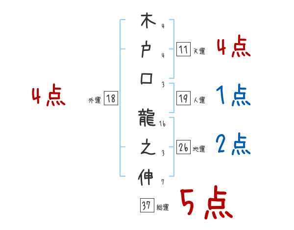天運![]() | 木戸口龍之伸さんの天運は11画の4つ星!着実に富や地位を得る幸運な人生。 家系が持つ宿命的な運勢を表します。祖先から受け継いだ苗字ですので自分の力が及びません。家柄を象徴します。 |