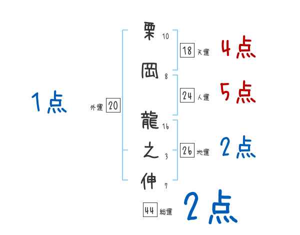 天運![]() | 栗岡龍之伸さんの天運は18画の4つ星!情熱的で剛気。忍耐力があり信頼される。 家系が持つ宿命的な運勢を表します。祖先から受け継いだ苗字ですので自分の力が及びません。家柄を象徴します。 |