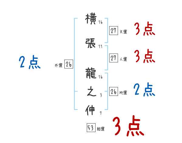 総運![]() | 横張龍之伸さんの総運は53画の3つ星!やや見栄っ張りで虚栄心がある。散財に注意。 あなたの人生を表す1番重要な運勢です。生涯を通じて影響する総合運となり、主に50歳以降の晩年期に影響を及ぼします。 |