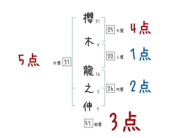 | 総運  | 櫻木龍之伸さんの総運は51画の3つ星!変化が激しく、危険に注意。堅実な性格。あなたの人生を表す1番重要な運勢です。生涯を通じて影響する総合運となり、主に50歳以降の晩年期に影響を及ぼします。 |