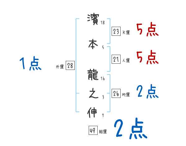 天運![]() | 濱本龍之伸さんの天運は23画の5つ星!想像力に優れ活力がある。一代で成功し名誉を手に入れる。 家系が持つ宿命的な運勢を表します。祖先から受け継いだ苗字ですので自分の力が及びません。家柄を象徴します。 |