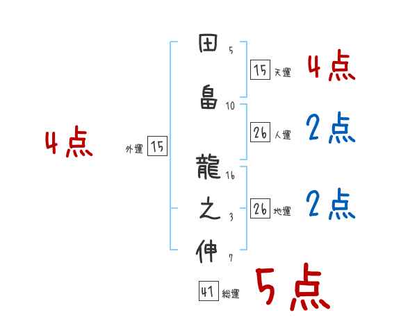 天運![]() | 田畠龍之伸さんの天運は15画の4つ星!人徳があり出世する。順調に物事を進め円満な人生。 家系が持つ宿命的な運勢を表します。祖先から受け継いだ苗字ですので自分の力が及びません。家柄を象徴します。 |
