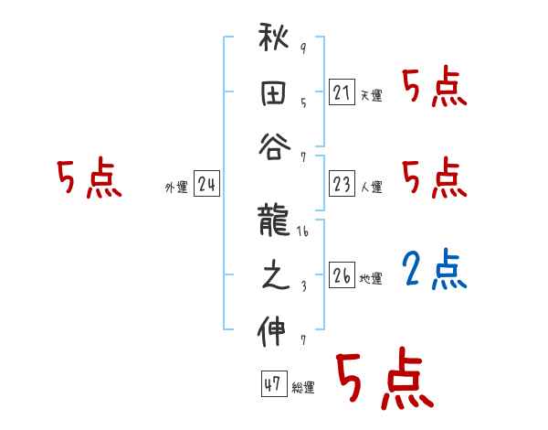 総運![]() | 秋田谷龍之伸さんの総運は47画の5つ星!実力が開花し発展する円満な人生。財に恵まれる。 あなたの人生を表す1番重要な運勢です。生涯を通じて影響する総合運となり、主に50歳以降の晩年期に影響を及ぼします。 |