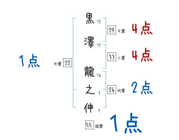 外運![]() | 黒澤龍之伸さんの外運は22画の1つ星!努力することが苦手ないっぽう手先が器用。芸術性にも優れる。 生活面を象徴する運勢です。外部から受ける影響力を表し、結婚運、家庭運や職場、環境への順応性を表します。 |