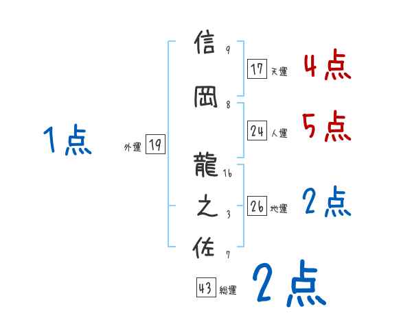 天運![]() | 信岡龍之佐さんの天運は17画の4つ星!積極的な行動力。地位を気づき財産を手に入れる。純粋な心と直感力。 家系が持つ宿命的な運勢を表します。祖先から受け継いだ苗字ですので自分の力が及びません。家柄を象徴します。 |