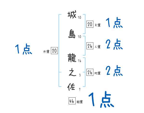 総運![]() | 城島龍之佐さんの総運は46画の1つ星!迷走することが多く苦労するかも。目先のことにとらわれないように。 あなたの人生を表す1番重要な運勢です。生涯を通じて影響する総合運となり、主に50歳以降の晩年期に影響を及ぼします。 |