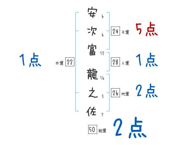 天運![]() | 安次富龍之佐さんの天運は24画の5つ星!家庭運が良く順調な人生。金運にも恵まれる。 家系が持つ宿命的な運勢を表します。祖先から受け継いだ苗字ですので自分の力が及びません。家柄を象徴します。 |