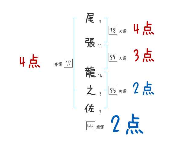 外運![]() | 尾張龍之佐さんの外運は17画の4つ星!積極的な行動力。地位を気づき財産を手に入れる。純粋な心と直感力。 生活面を象徴する運勢です。外部から受ける影響力を表し、結婚運、家庭運や職場、環境への順応性を表します。 |