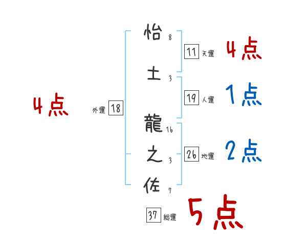 天運![]() | 怡土龍之佐さんの天運は11画の4つ星!着実に富や地位を得る幸運な人生。 家系が持つ宿命的な運勢を表します。祖先から受け継いだ苗字ですので自分の力が及びません。家柄を象徴します。 |