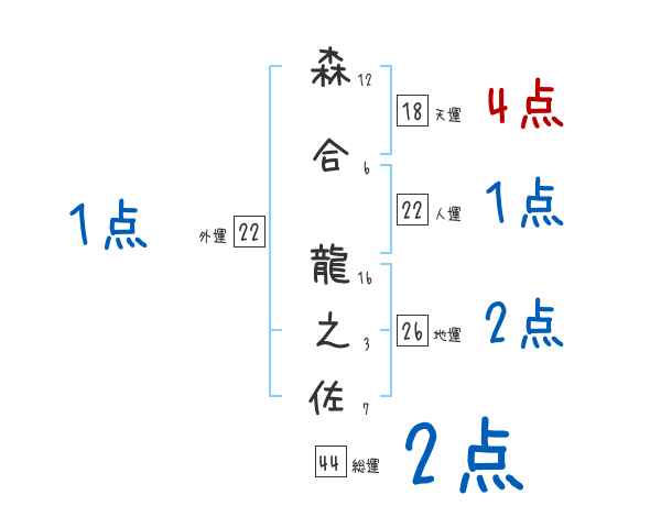 総運![]() | 森合龍之佐さんの総運は44画の2つ星!誠実で慎重な性格。物事を考えすぎないように注意しましょう。 あなたの人生を表す1番重要な運勢です。生涯を通じて影響する総合運となり、主に50歳以降の晩年期に影響を及ぼします。 |