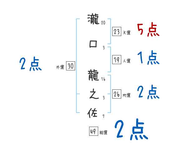 | 総運  | 瀧口龍之佐さんの総運は49画の2つ星!不安定な性格で明暗がある人生。周りの人には支援されやすい。あなたの人生を表す1番重要な運勢です。生涯を通じて影響する総合運となり、主に50歳以降の晩年期に影響を及ぼします。 |