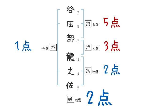 | 天運  | 谷田部龍之佐さんの天運は23画の5つ星!想像力に優れ活力がある。一代で成功し名誉を手に入れる。家系が持つ宿命的な運勢を表します。祖先から受け継いだ苗字ですので自分の力が及びません。家柄を象徴します。 |