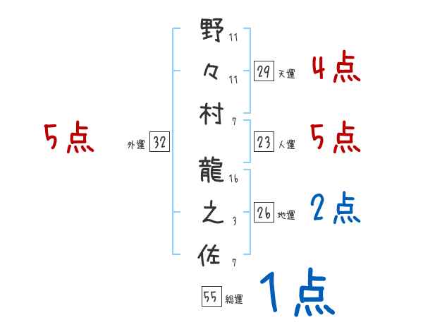 | 外運  | 野々村龍之佐さんの外運は32画の5つ星!柔軟性があり成功する。チャンスが多く金運が良い。生活面を象徴する運勢です。外部から受ける影響力を表し、結婚運、家庭運や職場、環境への順応性を表します。 |