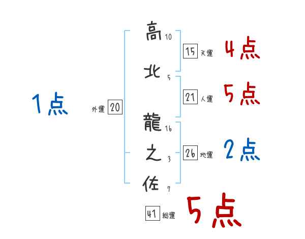 人運![]() | 高北龍之佐さんの人運は21画の5つ星!統率力がある。独立し成功する。名誉を手に入れる。 性格や才能などを表す2番目に重要な運勢です。人間関係や協調性、社会的な成功に影響します。主に20歳から50歳ぐらいまでの中年期の運勢を表します。 |