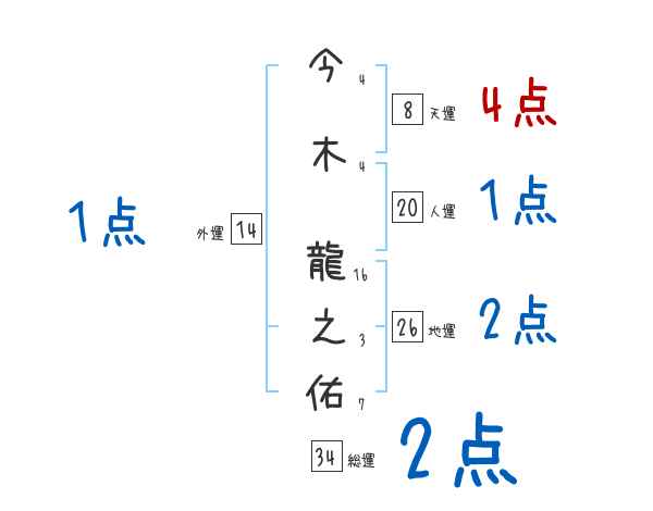 天運![]() | 今木龍之佑さんの天運は8画の4つ星!勤勉家。根気強く努力し成功する。忍耐力がある。 家系が持つ宿命的な運勢を表します。祖先から受け継いだ苗字ですので自分の力が及びません。家柄を象徴します。 |