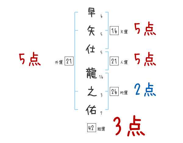 天運![]() | 早矢仕龍之佑さんの天運は16画の5つ星!人望が厚く大きく発展する。逆転成功が見える。 家系が持つ宿命的な運勢を表します。祖先から受け継いだ苗字ですので自分の力が及びません。家柄を象徴します。 |
